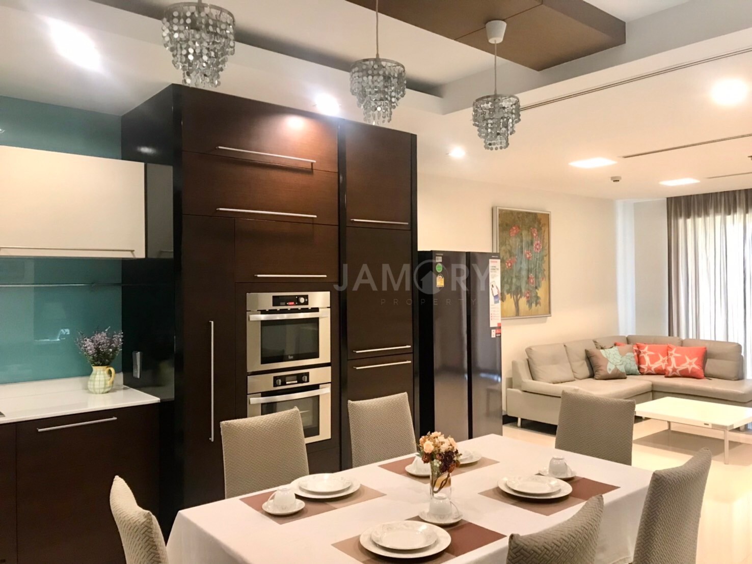 A built-in European kitchen and a living area.