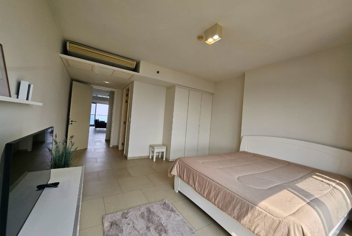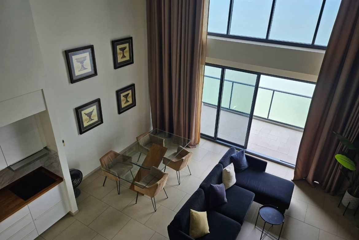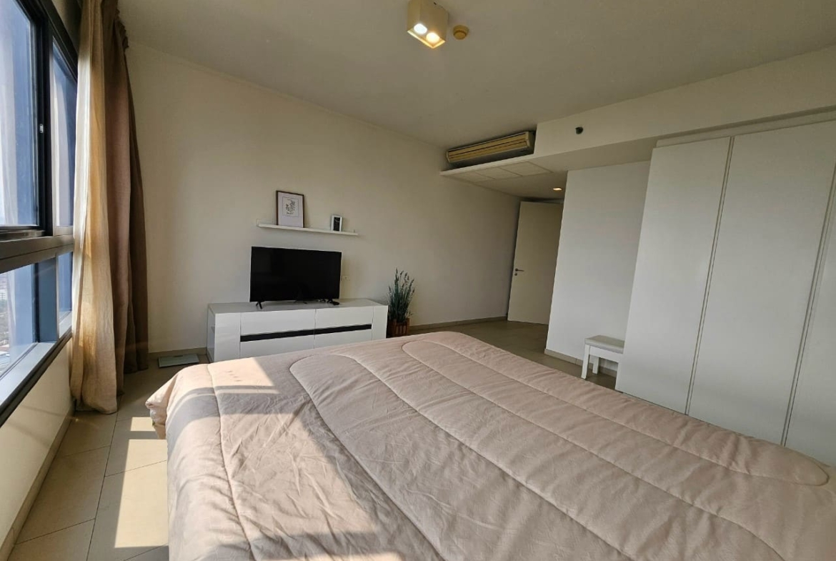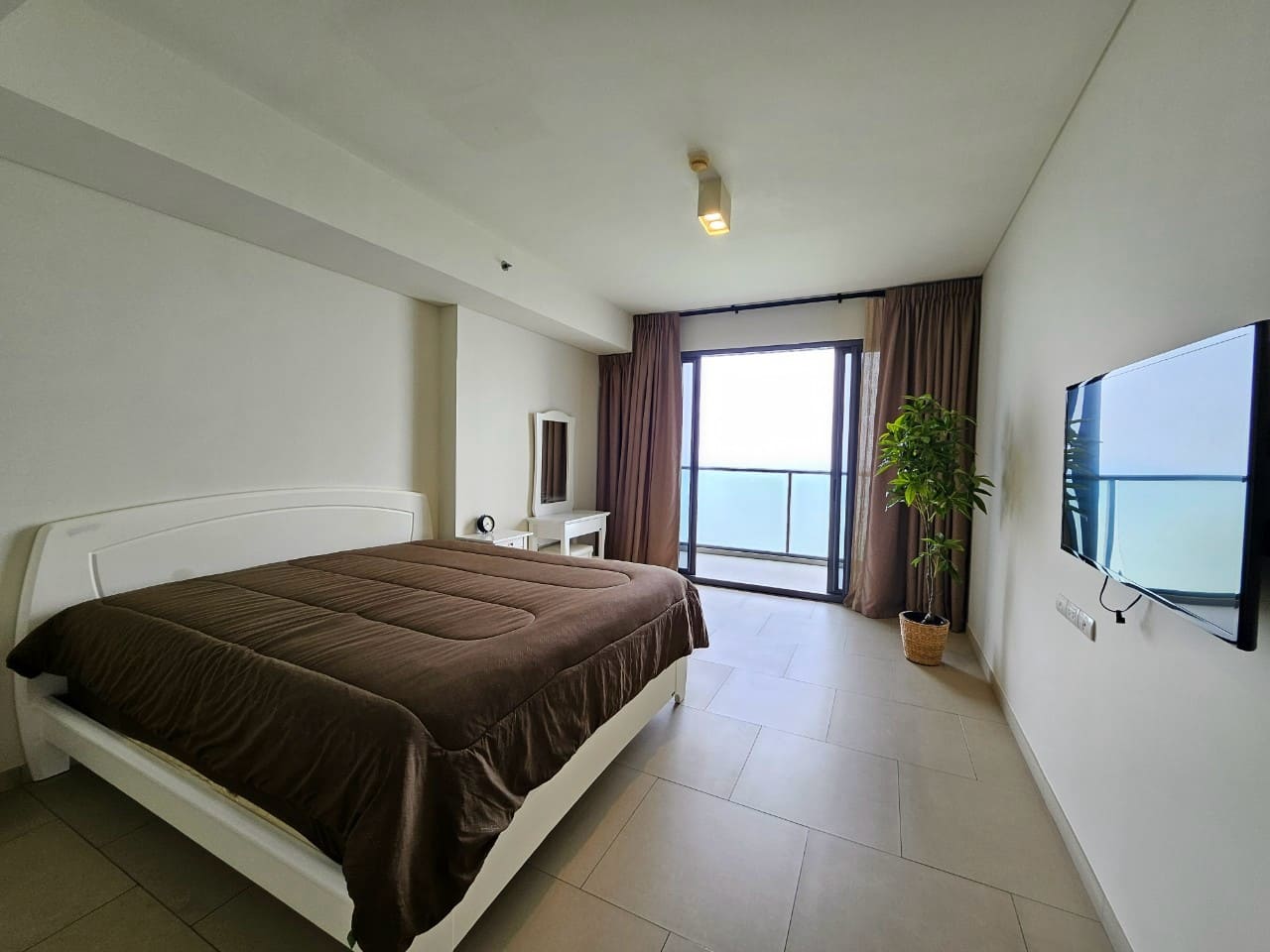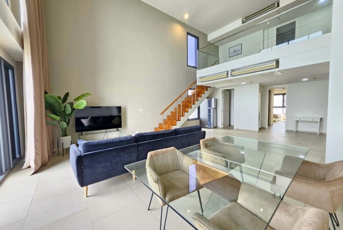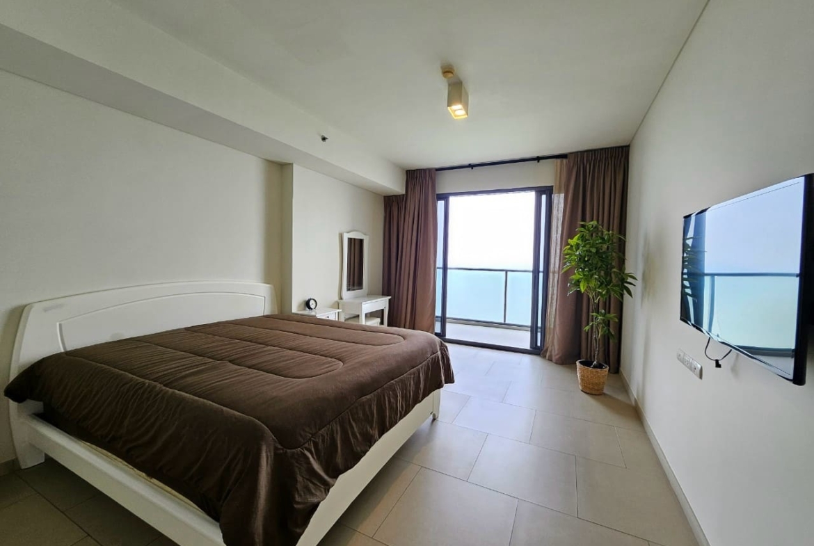 A penthouse with three bedrooms, offering a stunning sea view. It features simple and elegant decoration, located just 5 minutes away from a shopping mall.