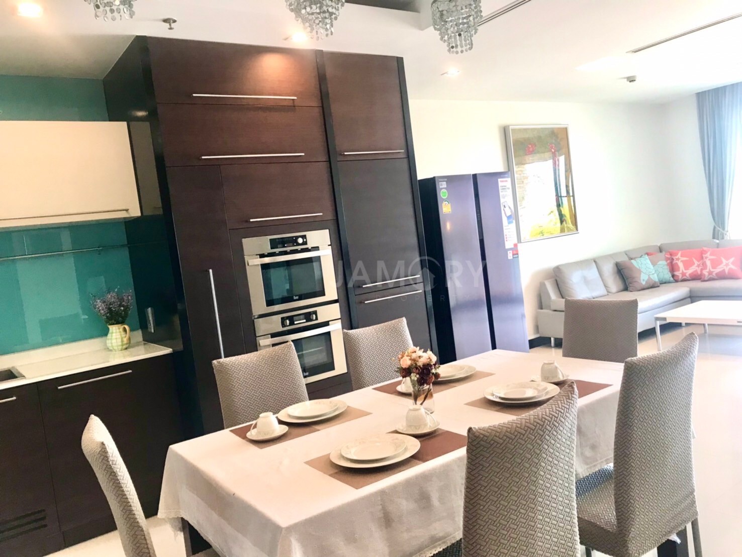 A built-in European kitchen and a living area.