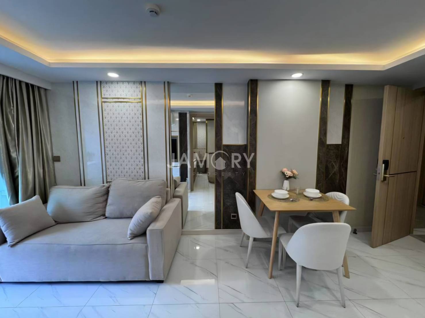 “Dusit Grand Park 2” offers luxury from the project entrance to your front door. The project comes with a modern style decoration with high buildings surrounding the shady common area. There is a large lagoon swimming pool decorated with a golden lion sculpture and outdoor patios. It also allows you to enjoy a wide range of facilities provided. It is also surrounded by many famous tourist attractions, whether Jomtien Beach South, Pattaya Night Bazaar, South Pattaya Beach, and several convenience stores nearby.