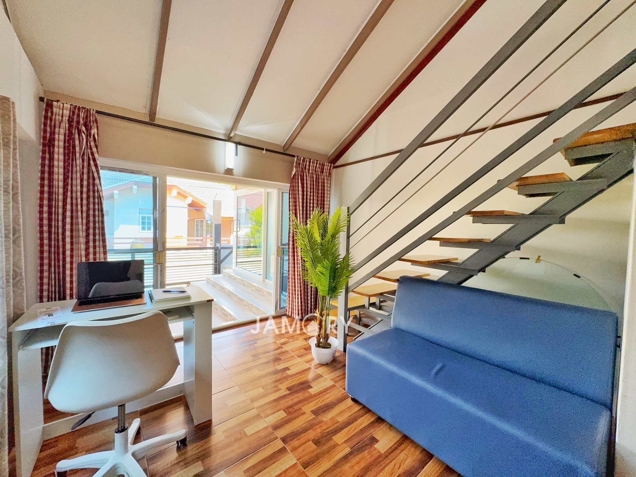 • Loft Studio — Mezzanine sleeping area, workspace, and ensuite bathroom