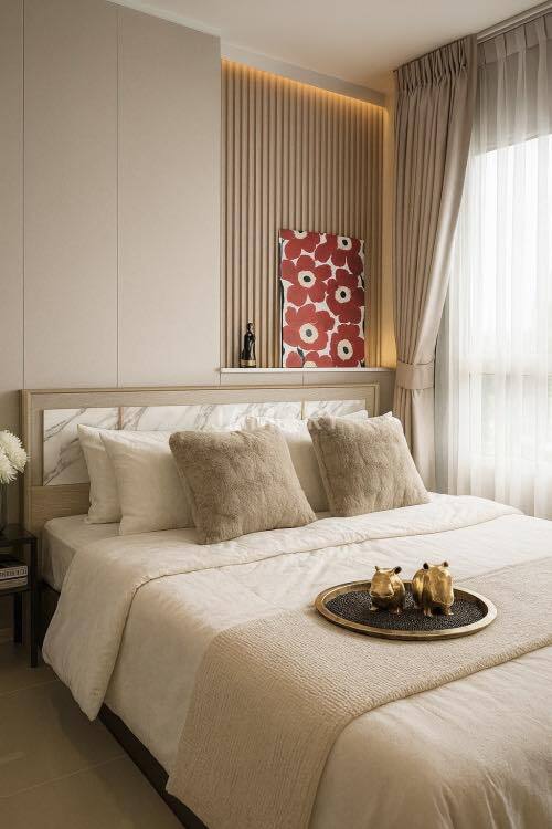 Lumpini Ville Naklua – Wongamat is located on Pattaya-Naklua Road, Bang Lamung District, Chonburi Province. The project covers approximately 12 rai (approximately 12 acres) and consists of Building A (20 stories, 532 units); Building B (28 stories, 790 units); and Building C (30 stories, 846 units). The interior is fully furnished with a living room set, bed, wardrobe, curtains, kitchen counter, dining table, and work desk. Appliances include a TV, air conditioner, refrigerator, microwave, and water heater. Amenities include a swimming pool, fitness center, library, garden, playground, parking, and more. Nearby attractions include North Pattaya Beach, Naklua Beach, Wong Prachan Beach, Wong Amat Beach, the Sanctuary of Truth, Ripley’s Believe It or Not, Central Pattaya Festival, Mini Siam, and Bangkok Pattaya Hospital.