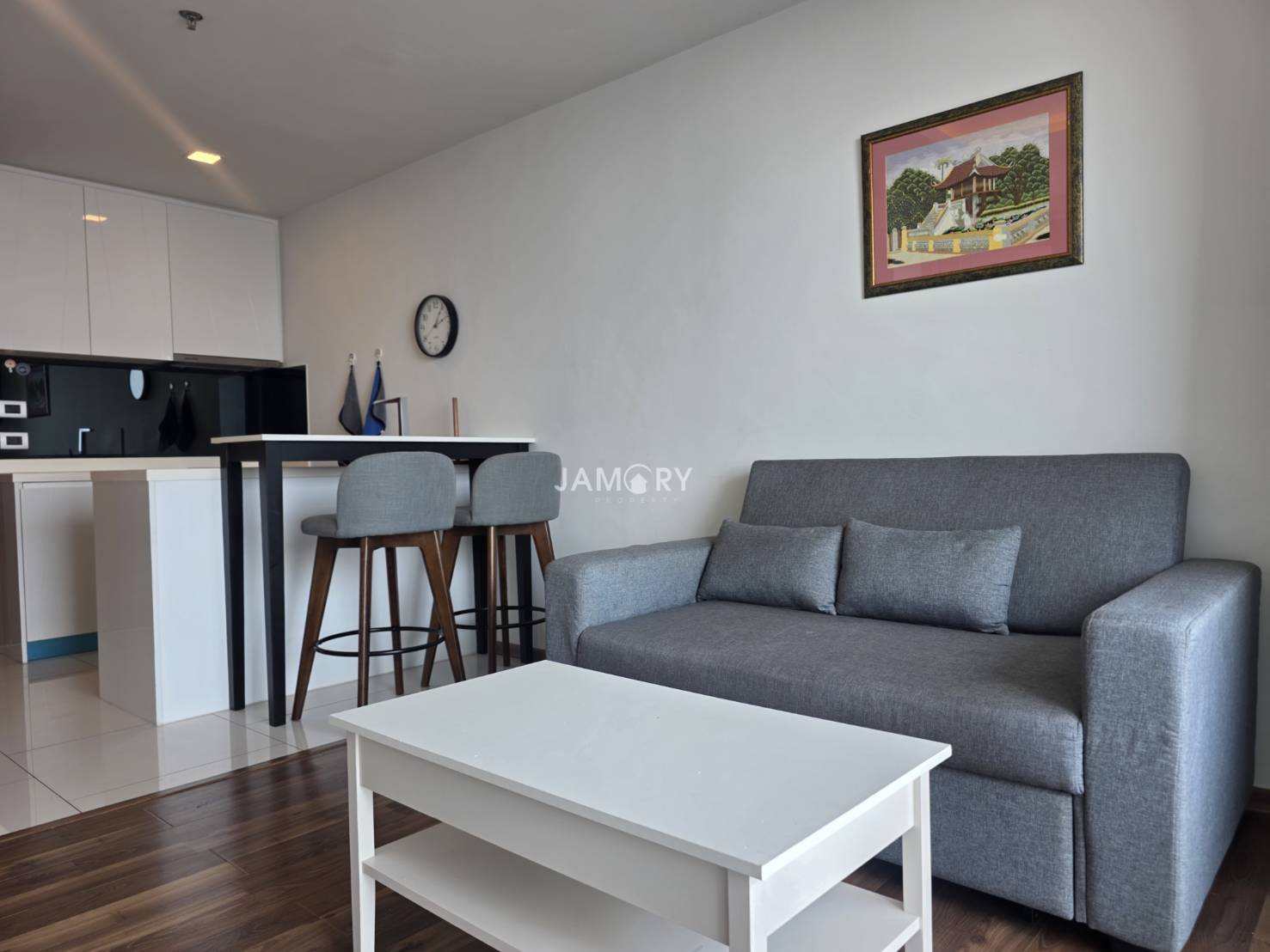 The unit features a well-designed layout with a cozy living area, modern kitchen, and comfortable bedroom. Large windows allow natural light and good ventilation, creating a bright and airy living space.