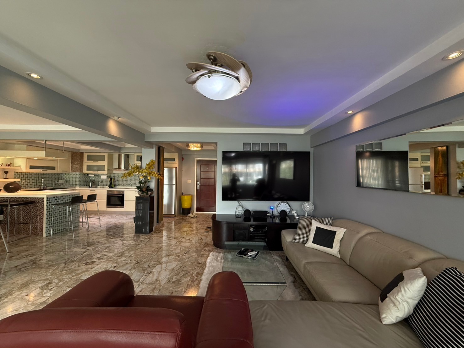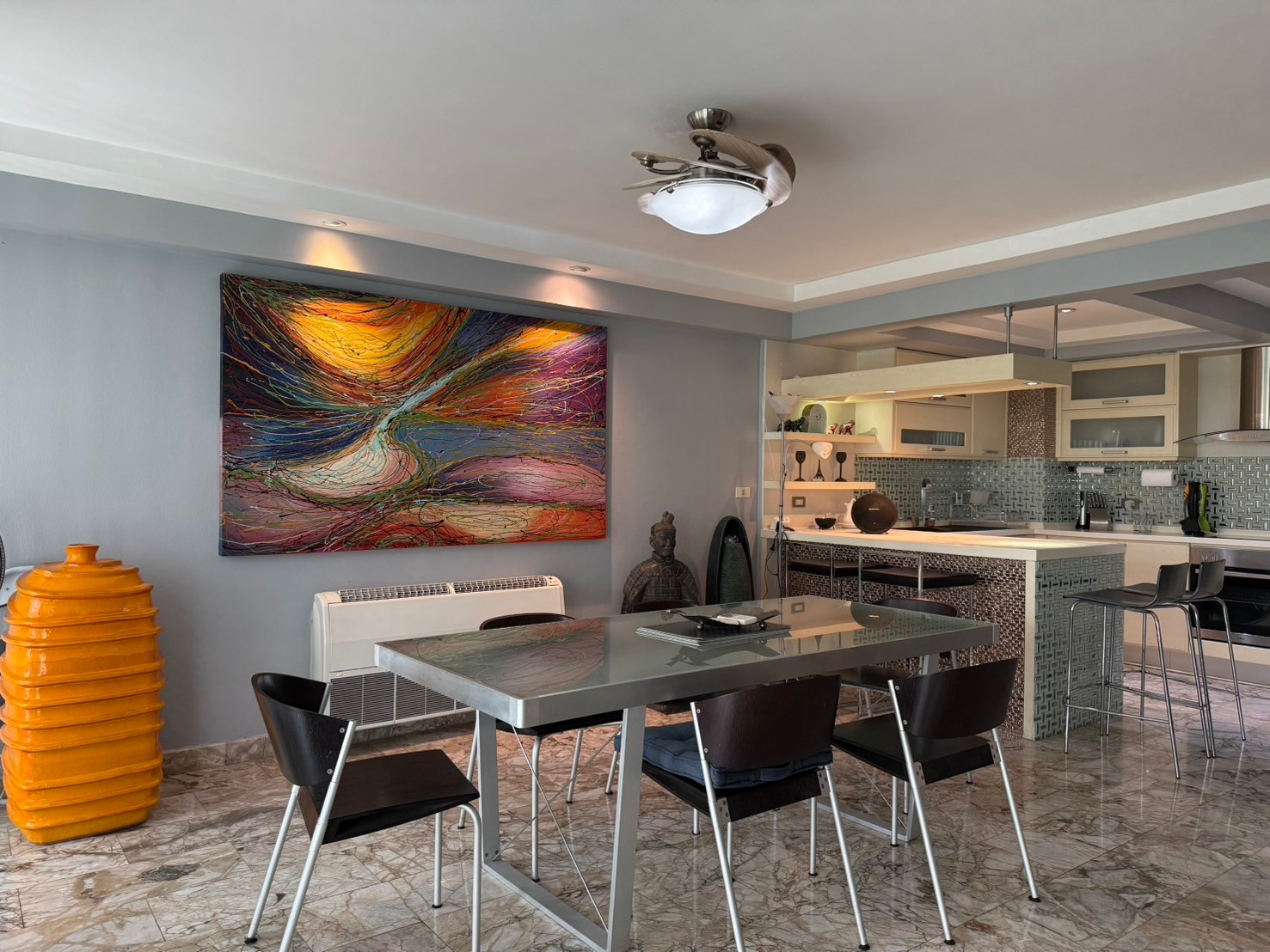 Gypsum board ceilings with ceiling mounted atmospheric down-lighting.
