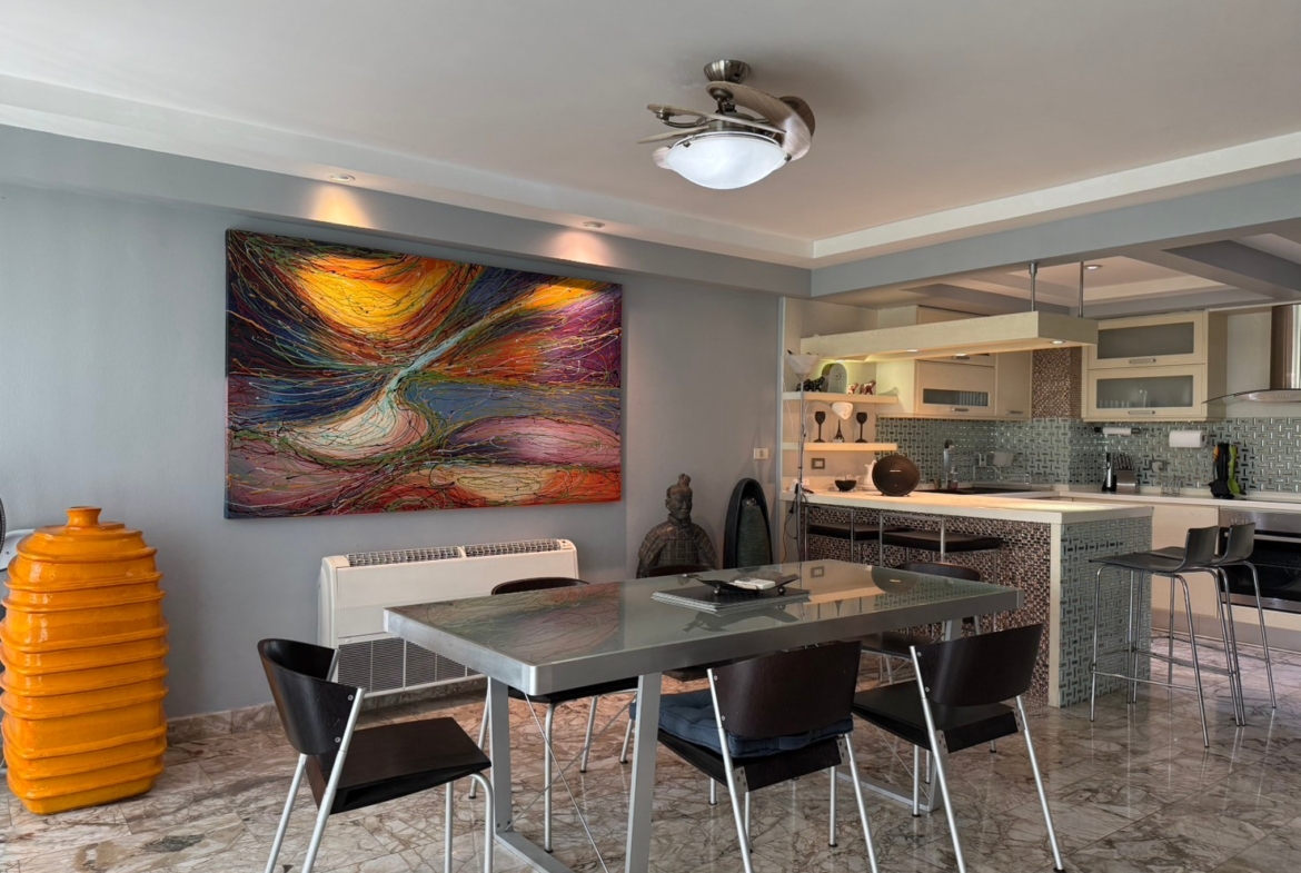 Private balcony with ornate stainless-steel balustrades for optimal city views.
