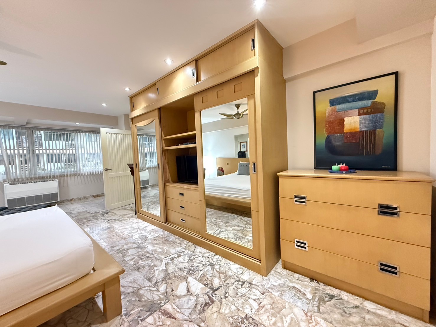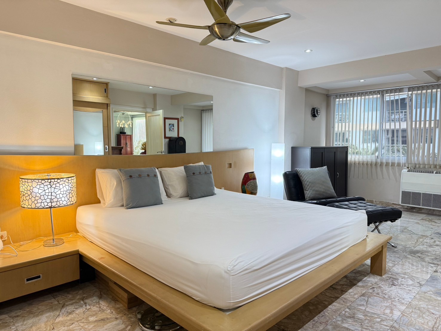 Slim-line air-conditioner in every apartment with the compressor being mounted off to the side on the balcony.